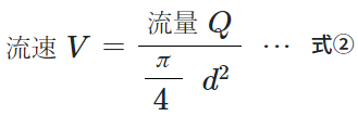 管の断面積Aは管の口径dに置き換えることができますので、式①は式②のように変形できます。