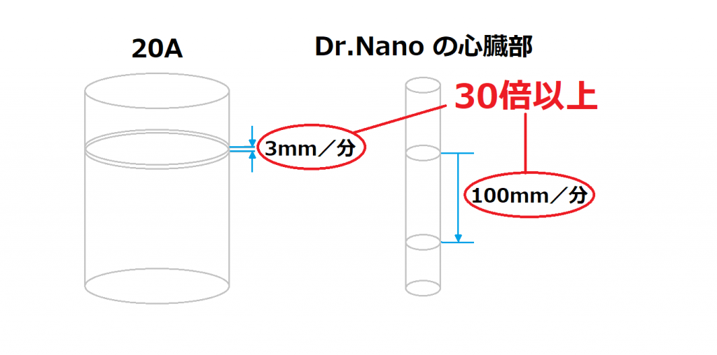 一方、Dr. Nanoはユニットの必要流量2L/分を確保しつつ、20Aの30倍以上の流速Vを発生させてから急減速することで、1L/分未満の小流量でもキャビテーションを発生させることを可能としています。