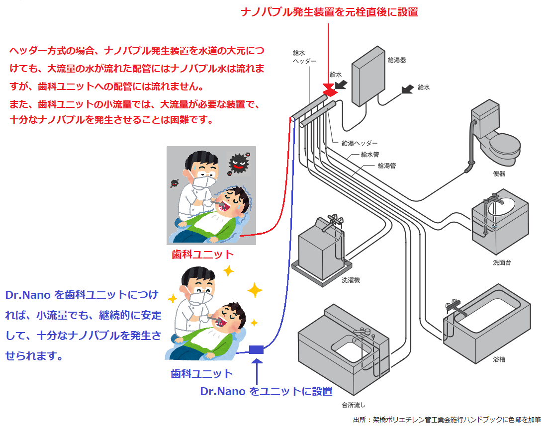 A. 本管から施設内に入ってすぐに蛇口向けの配管に分岐しますので(特にヘッダー方式※の場合)、手洗い、トイレ向けの配管にはナノバブル水が供給されますが、歯科ユニット向け配管にはナノバブル水が来ません。